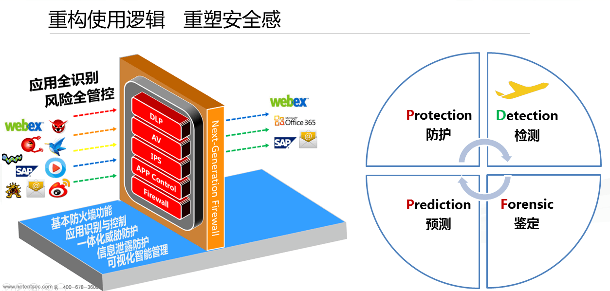 熊瑛在演讲中提出安 全感包括两部分,一是能够感知甚至预知风险,二是当风险来临,能够有力的对抗威胁。传统防火墙已经无法给用户带来安全感,长期以来,防火墙的演进都在致力 于数据通信能力,访问控制能力和特征匹配的能力的提升,这些其实都属于对抗能力。但防火墙一直忽略了第四大能力的提升——洞察力,并由此引出了下一代防火 墙的定义。
