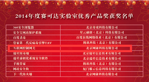 近日,由全球第三方权威评测机构西海岸实验室在华旗下机构——赛可达实验室,评比颁发的“2014年度卓绝产品奖”新锐出炉,来自腾讯、百度、360、网康、瑞星等知名企业的10款网络安全产品,以优异的年度表现分别获得各自相关领域“卓绝产品奖”。其中,网康上网行为管理(即互联网控制网关:以下简称ICG)、下一代防火墙(NGFW)两款产品分获此殊荣。