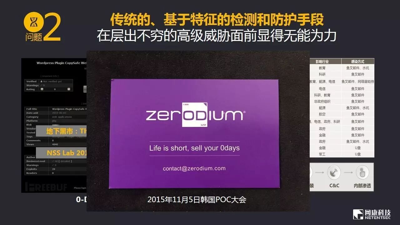 第二,高级威胁特别是0day漏洞,给安全带来越来越大的隐患。网络安全黑色产业链已经非常成熟,0day漏洞的挖掘与交易已经完全公开化。这是一张名片,写的是:人生苦短,不如卖个漏洞 2015年韩国POC黑客大会上,Zerodium公司四处分发的名片,公开收购0day漏洞。