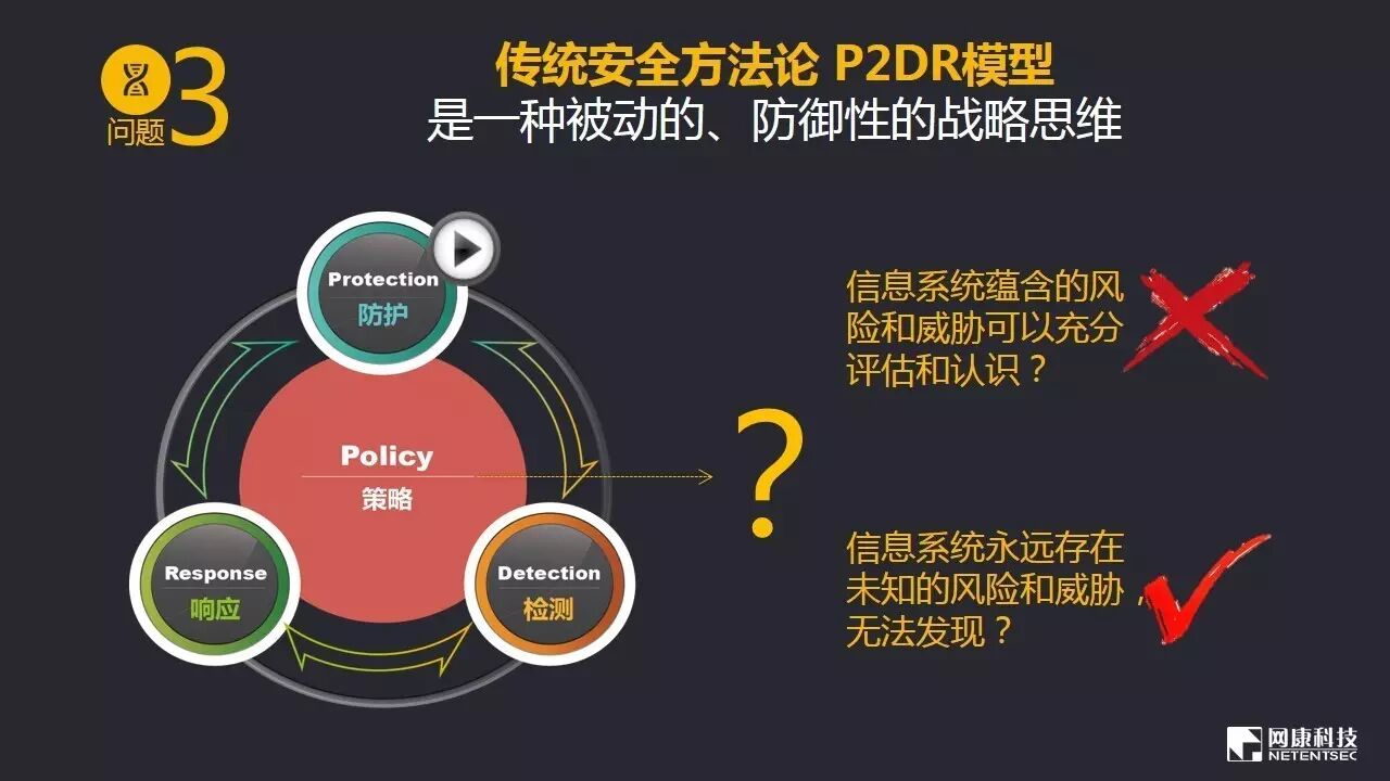 第三,传统的安全防护的方法论模型存在很大的问题。传统安全模型中,我们会评估业务系统的级别和存在的风险,做出相应的防护策略,然后不断检测威胁,实施防御。这个模型的一个关键前提是,威胁是可以充分评估的,但这显然不符合事实。事实是,业务系统永远存在未知的风险和威胁。