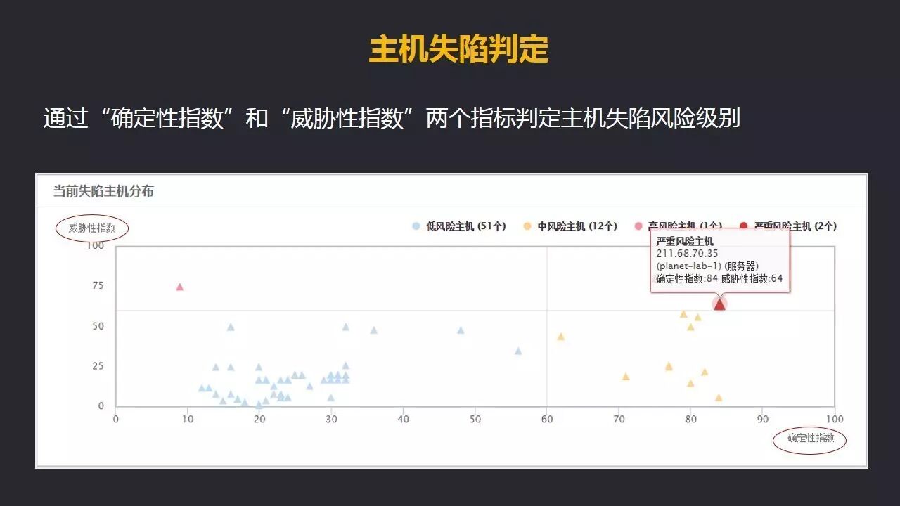 利用基于异常行为的深度识别能力和威胁情报技术,通过威胁活动的几个阶段(遭受入侵、受到控制、发起内部攻击、发起恶意行为),分析出当前主机的确定性指数和威胁性指数,并勾画出指定时间内该主机失陷情况的走势图,从而判断出失陷主机的活跃程度和风险级别。