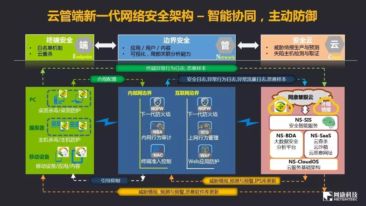 网康做为新一代安全厂商,对于整个安全的防护理念是:安全不是静态的、单点孤立的防护措施,而必须是动态的、联动的防护体系。云管端联动是网康提倡的更有效的安全框架,在这个框架下,关键是要做到智能协同、主动防御,端和管好比人的手和脚,负责收集数据和执行命令,云好比大脑,负责分析数据和发出命令。只有云管端互相配合,才能真正有效识别已知和未知威胁,有效阻断已知和未知威胁。
