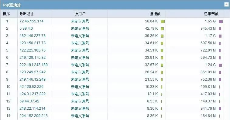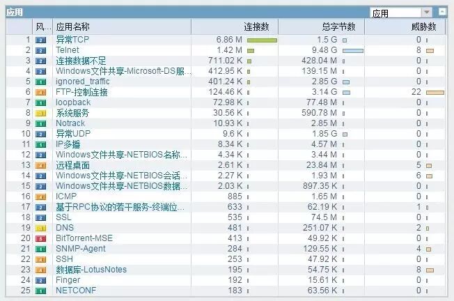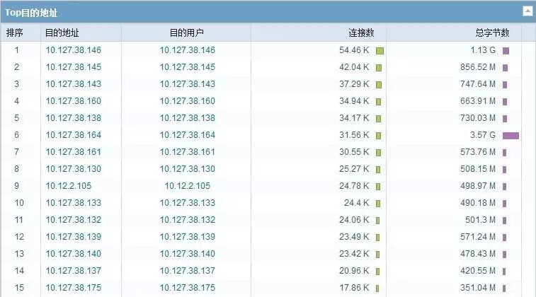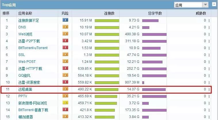 为帮助各位读者对可视化价值有一个更深刻理解,小编在这里也跟大家分享一个亲身经历的故事。有一次在一个客户现场做技术支持,设备刚上线不久,正和客户聊的高兴时候,客户突然面露异色,盯着屏幕不说话了。我也将注意力放到了显示器上,界面上显示正是top应用。顺着他的目光,从上往下看,当看到远程桌面,连接数490.22k,总字节数14.07G,瞬间明白,可能出事了!