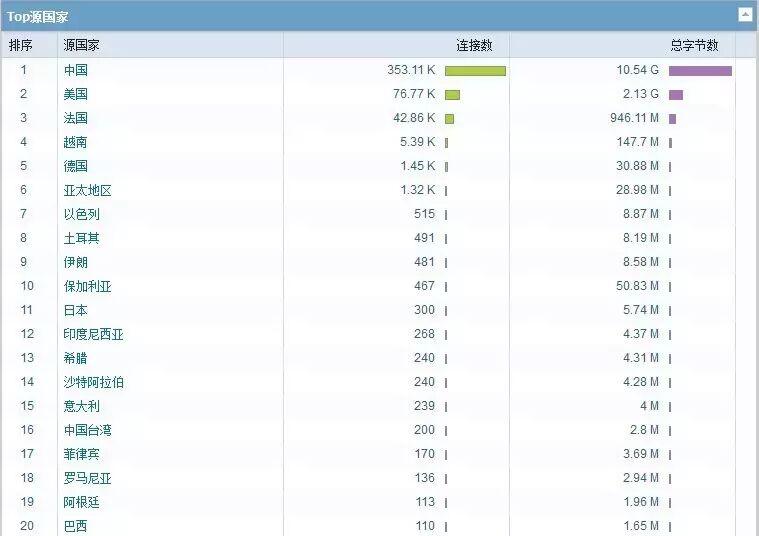 在继续往下钻取过程,让人更惊讶的是,源IP地址是来源于不同国家,尤其是来源于美国IP连接上,居然有2.13G流量,此刻基本上确认发生啥事了。