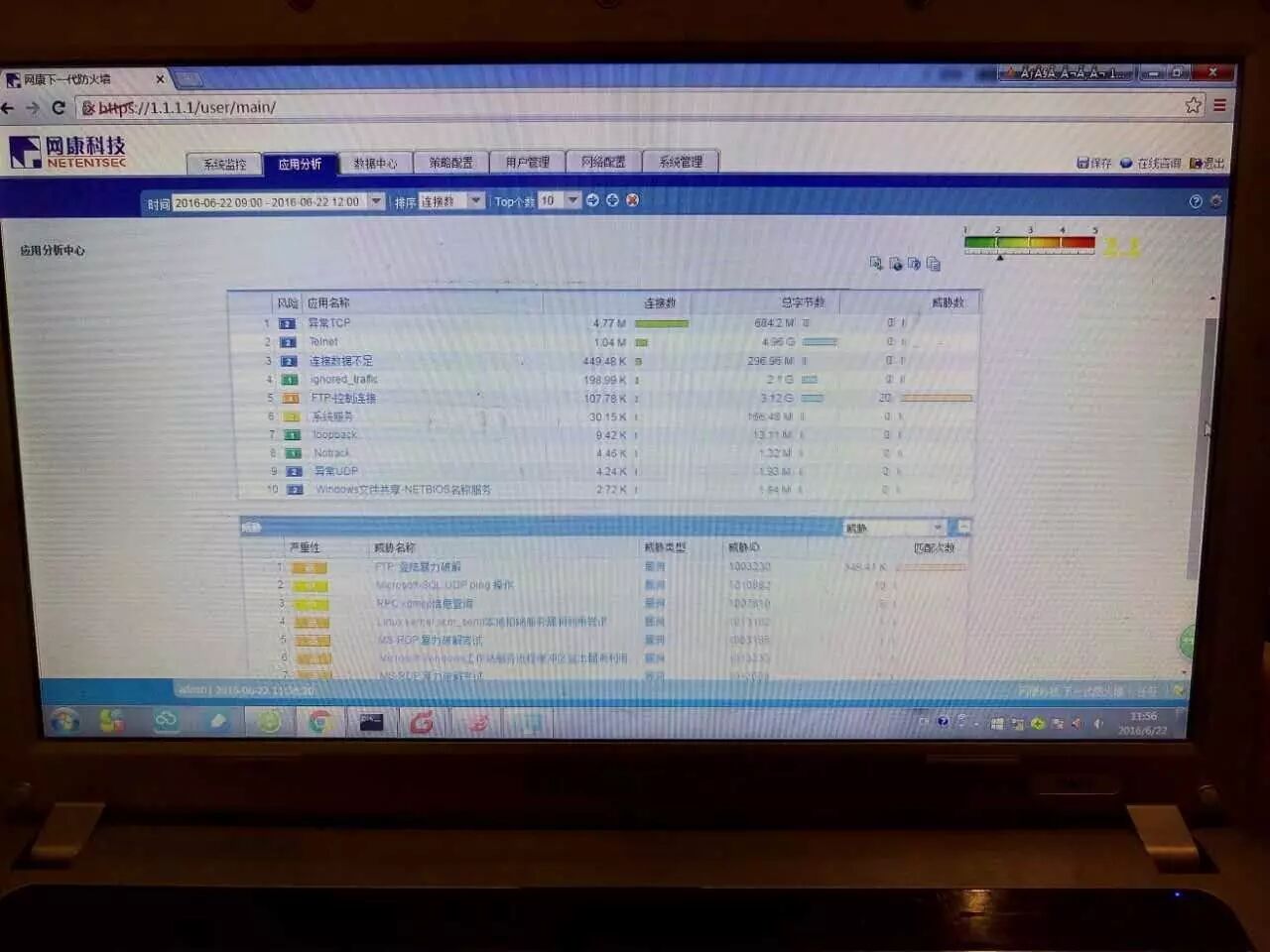 网康下一代防火墙以可视化能力赢得了主办方的认可。观摩会场与比赛会场之间用视频会议系统连接,观摩会场左边的屏幕显示赛场的视频实况,右边的屏幕显示NGFW的界面。