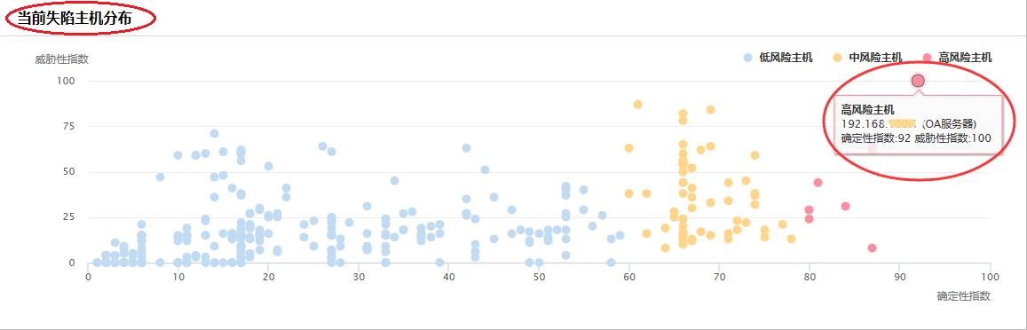 慧眼云可以帮助政府机构、重点企事业单位真正看到失陷主机。利用异常行为识别技术与威胁情报技术找到失陷主机后,慧眼云通过一张二维图进行全局的分布展示,基于“确定性指数”和“威胁性指数”两个维度划定不同的风险级别区域,让使用者一目了然的发现异常主机。