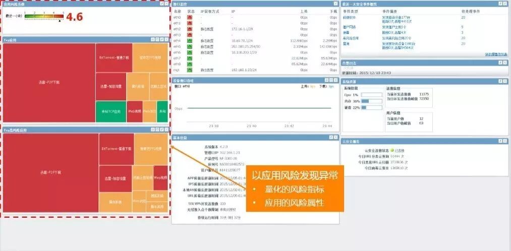 首先,解决“能见度”的问题,尽可能从多个维度去看一个应用,看清楚内部网络中流量、方向、内容等,需要进行应用、用户、内容的识别。