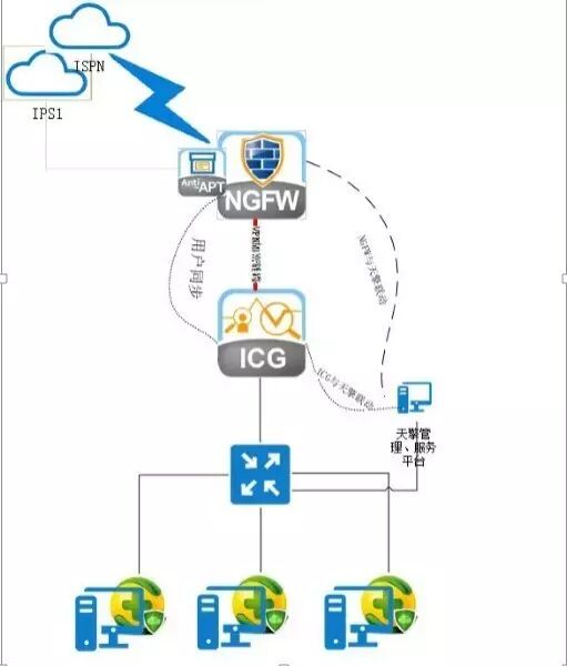 出口线路(电信和移动各一条)通过网康下一代防火墙(NGFW)做负载均衡,同时NGFW承担着防护边界安全的重要功能。通过部署上网行为管理(ICG)对网络用户进行流量控制,行为审计和管控;同时,部署360天擎为所有电脑终端提供安全保障。该方案将为整个系统提供一个从终端到边界的立体式的安全防护,为用户提供一个稳定,流畅,安全的上网环境。